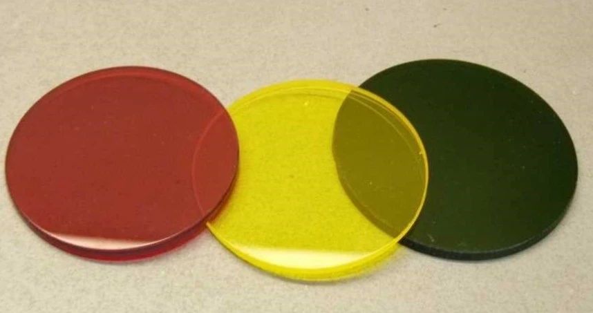 滤光片是塑料或玻璃片再加入特种染料做成的,红色滤光片只能让红光通过,如此类推。玻璃片的折射率原本与空气差不多,所有色光都可以通过,所以是透明的,但是染了染料后,分子结构变化,折射率也发生变化,对某些色光的通过就有变化了。比如一束白光通过蓝色滤光片,射出的是一束蓝光,而绿光、红光极少,大多数被滤光片吸收了。