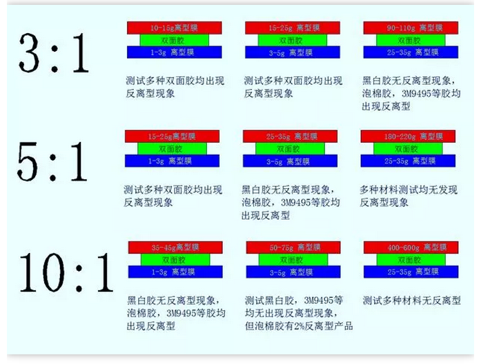PS:如果轻离型膜采用3克以下的,那重离型用9克,或者是15克,这样的搭配结果,我想这根本不需要测试,大家心理都明白这反离型的几率会有多大!
