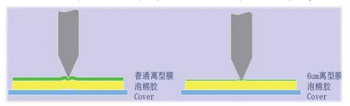 如图:对比后6um离型膜,可减少挤压,并可一次成型保证公差。