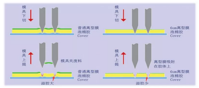 普通离型膜在模切时,会对双面胶产生比较严重的挤压,模切完后,会产生回粘,排废时会出现溢胶等现象。