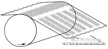 传统凹版印刷式涂布有一轮径与雕刻轮相同之橡胶轮作为背胶轮,基材从雕刻轮及背胶轮之间通过,基材在此接触(Nip)点易因机械或水力(Hydraulic)之应力问题造成基材皱折(如图四)而影响涂布品质,且基材愈薄,此一现象愈明显。微凹版印刷式涂布无背胶轮,自然也无接触点,当然就不会发生上述之应力问题。