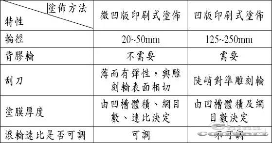 表一:微凹版印刷式涂布与凹版印刷式涂布之比较