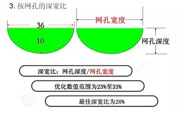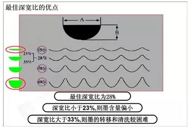 由于宽深比不同,上墨量是有区别的,所以对油墨的转移和清洗也有很大区别,如果宽深比大于33%清洗比较困难;如果宽深比较小,那么上墨就少,印刷的鲜艳度和层次感就会非常差。