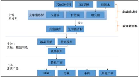 增亮膜可分为一般(微棱镜)增亮膜、多功能增亮膜、微透镜增亮膜和反射型偏光增亮膜。通常一片微棱镜增亮膜可提高 130%的亮度,一般背光模组搭配两张交叉的增亮膜最高可达到 260%的增益。背光模组是为 TFT-LCD 液晶显示器中提供外加光源的器件。液晶显示器下游用途广泛,可用于各种规格电视、电脑显示器、手机、数码相机等产品。
